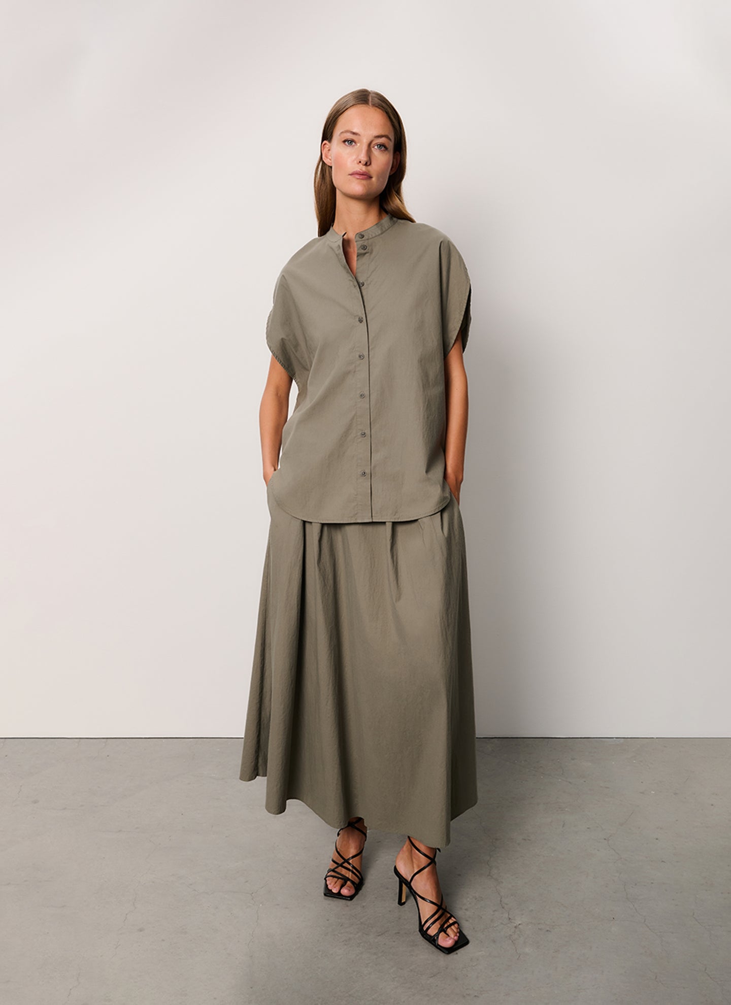 Step into elegance with the Kaneko skirt in smokey olive, crafted from a luxurious cotton lyocell stretch blend. This ankle-length skirt features graceful pleats that create a flowy silhouette, enhancing your natural movement. The wide elastic waistband provides exceptional comfort and a flattering fit, making it perfect for all-day wear. Style the Kaneko skirt with the Tomiko blouse for a chic, coordinated outfit that effortlessly transitions from day to evening. Embrace versatile sophistication with this essential piece that adds a touch of elegance to any wardrobe.