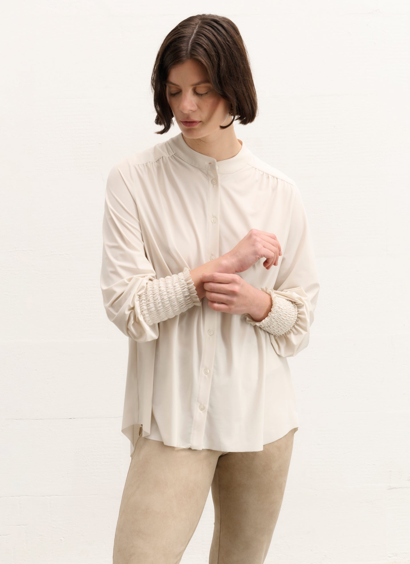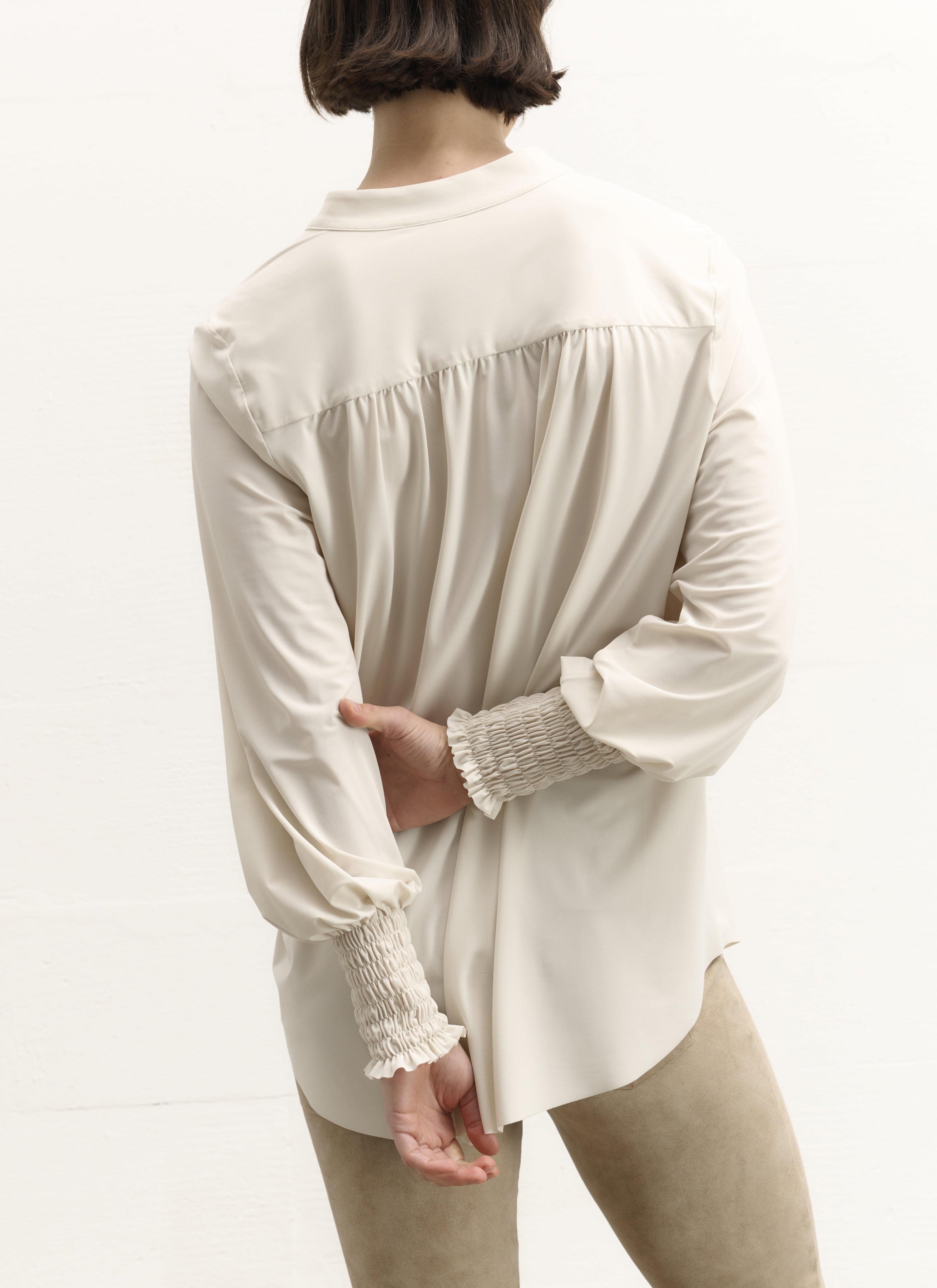 The standout feature of the Yukoya Blouse is its beautifully detailed sleeves. The smocked cuffs create a delicate, gathered effect that enhances the visual appeal and adds a subtle flair to the overall design. It's made of a supple, stretchy, and wrinkle-free material blend.